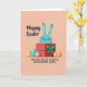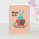This card features a cute long-eared bunny in soft light teal 🐰, peeking out of a bright red gift box tied with a deep green ribbon and a neatly looped bow. The bunny’s eyes are closed in a gentle smile, with a rosy blush that feels like a shy, affectionate moment shared with someone close. Around the box, several decorated egg shapes float like a friendly circle of little surprises, adding a sense of togetherness to the scene. The eggs show sunny yellow stripes, turquoise polka dots, pale pink diagonal lines, and a rich magenta swirl, each pattern looking like a small note passed between friends. A warm peach background keeps everything cozy and lets the reds, greens, and pastels stand out without feeling harsh. A flowing cursive-style message sits near the top and bottom in a dark contrasting color, framing the illustration with an easy, romantic touch 🌷. The shading is light and smooth, and the green bow on the box has crisp loops and trailing ribbon ends.