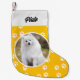 Festive Cute Dog Pet Photo Small Christmas Stocking with dog paw print pattern on dark yellow background. Personalise it with your pet name and pet photo.