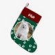 Festive Cute Dog Pet Photo Small Christmas Stocking with dog paw print pattern on red and green background. Personalise it with your pet name and pet photo.