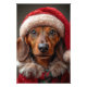 The image shows an adorable dachshund dressed up in festive attire, featuring a red Santa Claus hat with fluffy white trim. The dog's large, expressive eyes and shiny black nose are the focal points of the close-up shot, creating a heartwarming and charming holiday vibe. The dachshund is also wearing a cosy red outfit with a faux fur collar, adding to the festive and warm atmosphere of the scene.