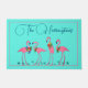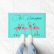 Flamingos doormat personalised with family name. Tropical blue colour with four pink flamingos standing among little blue sea stars. They wear festive wreaths of hibiscus flowers and sprigs of holly greenery. The family name can be added across the top in swirling script, or change the text to something else such as “welcome”. Because of the holly, this mat can be a Christmas welcome, or use it year round.