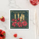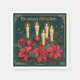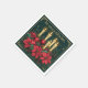 Surrounded by traditional holiday greenery, including lush red poinsettias, holly sprigs, pine branches, and clusters of red berries, the design radiates festive charm. Red Christmas ornaments enhance the holiday aesthetic, while a deep green background adorned with golden snowflakes and ornate corner decorations adds a luxurious touch. The rich palette of golds, reds, and greens captures the classic holiday aesthetic, making these napkins perfect for decoupage, holiday gatherings, or religious-themed crafts.