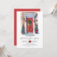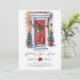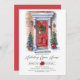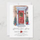 Our Holiday Open House invitation showcases a stunning front door adorned with green Christmas garland, vibrant poinsettia flowers, and a classic pine wreath on a red door. It is the perfect way to invite guests to join in the festive spirit and celebrate the holiday season together.
