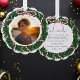 A super fun and unique holiday card that is also a christmas tree ornament - or hang from anywhere. Front side features your custom photo highlighted by a fun botanical wreath. The back side features your custom greeting, letter/note and your names. Festive, fun and classic - your friends and family will truly enjoy this holiday card.