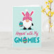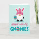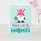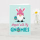 This card features a small folklore-style figure near the top against a pale aqua background, giving the scene an airy spring look 🌷. The character wears a bright fuchsia knit cap topped with tall bunny ears in white and pink and a fluffy pom-pom, and the tucked-away face feels friendly and bashful, like it’s leaning in for a laugh 🐰. A rosy nose peeks out above a big, shaggy white beard that softens the whole look and adds a cozy, companionable mood. In one hand, the figure holds a teal striped oval with bands of hot pink and lime green, like a decorated egg offered as a sweet little gesture. Below the illustration, the phrase “Hoppin’ with My” sits in fuchsia lettering, centered and slightly curved for a light, affectionate tone. Under that, “GNOMIES” appears in large teal letters, and the “O” is replaced by a matching striped oval to echo the one being held. The layout keeps the character floating above the words so the eye moves from the shy face down to the message. The accents of fuchsia, teal, and lime green stand out crisply on the soft aqua field, with the striped oval “O” nestled neatly in the middle of the final word.
