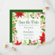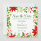 This classic green Christmas wedding Save the Date card features bright poinsettia flowers at the bottom right of your invite and red holly berries and greenery on the top left. A festive and bright botanical invitation for a holiday wedding with green script.