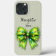 Festive Green Furry Bow-Lights Naughty or Nice Phone 13 Pro Max Case. This fun holiday-themed case has a fuzzy green bow wrapped in mini lights, adding a whimsical touch. The phrase "Naughty or Nice" is featured, perfect for a playful seasonal vibe.