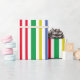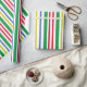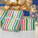Bright green, red, gold and blue vertical stripes on a white background creates a beautiful and festive wrapping paper for your holiday gifts!