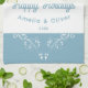 Festive Happy Holidays Foliage Blue Couple Photo kitchen towel. Lovely white foliage on a blue background. Personalise the towel with your names, photo and year.