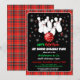 This festive holiday bowling party invitation features bowling pins with red glitter and a red bowling ball with snowflakes pattern on a cheerful red plaid background the perfect design to spread seasonal fun and party cheer.