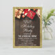 Festive holiday party invitation with a sparkly gold glitter sparkles border, red gifts with bows and elegant white writing on rustic dark brown wood. This is a perfect holiday/ Christmas/ winter invitation!