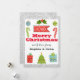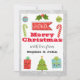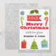 Festive holiday Merry Christmas card with a silver glitter sparkles border and white background. The words "Merry Christmas" are written in a bold red script. The card is decorated with cute little illustrations such as a Christmas tree, red and green candy canes, a gift and holly leaves. At the bottom of the sticker are the words "with love from" and your family name surname.