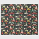 This cheerful wrapping paper features colourful cars alongside decorated Christmas trees, all set against a black background. Perfect for adding a festive touch to holiday gifts.