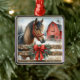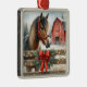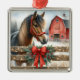 Christmas ornament. A pretty brown horse standing in front of a red rustic barn behind a fence with Christmas lights and a red bow.