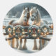 Two horses, a brown horse and white horse standing behind a fence lit with Christmas lights and wreaths on a snowy day.