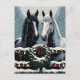 Pretty Christmas postcard with the graphics of a white horse and a black horse standing at a wooden gat decorated in holiday wreathes and pretty twinkling Christmas lights covered in snow. These horses are done in a cartoon comic book pop art style to invoke a nostalgic feeling Inside of card has a horse and Christmas pun. Add your own holiday message in the personalise area.