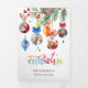 This is a bright, colourful and unique holiday greeting featuring four festive Christmas ornament-shaped photo templates hanging from a watercolor pine branch. Also featured is a cheery multicolored Merry Christmas text graphic in a custom decorative font. Includes editable text fields. The panels feature additional text fields, complementary Happy Holidays text graphic and floral and three additional photo templates.