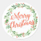 Festive Merry Christmas Wreath Sticker featuring greenery and red holly berries. Great for sealing envelopes or stickers on gifts!