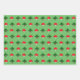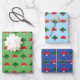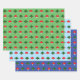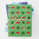 A festive cartoon mushrooms pattern. One has a cap like a Christmas tree and the other has a cap like a Santa hat. Each sheet has a different background colour: light green, ice blue and dark blue.
