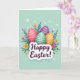 This design shows four decorated egg shapes grouped close together like friends leaning in, each with soft shading that makes them look gently rounded 🐰. One egg is bright pink with small white dots, another is deep purple with bands and scattered spots, a third is mint green with thin white stripes, and the last is warm orange with dotted markings. They sit among dark green leafy fronds that curl around them, creating a cozy, tucked-in feeling like a shared secret in a garden. The background is a light aquamarine wash, airy like an early spring sky, with tiny white circles and snowflake-like specks drifting around 🌷. Small five-petaled flowers in orange and soft pink are sprinkled between the leaves, adding little moments that feel like friendly glances across the scene. Near the lower center, a puffy white banner stretches horizontally, holding a short Easter greeting in deep purple lettering. The message sits centered on the banner, with the purple standing out clearly against the white shape and the pale blue behind it. Around the banner’s edges, the green fronds and a few tiny white specks overlap the space, while the four eggs remain clustered above in the middle.