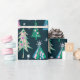 Festive pattern, Christmas and New Year decoration. Fantastic multi-coloured spruce forest on a dark greenish-blue background. Snow in the forest. Seamless pattern