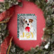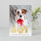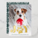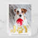 Whimsical holiday photo card features a favourite photo of your dog with "JOY" as a gold foil text overlay at the bottom. A sweet paw print illustration takes the place of the "O." Personalise with your custom greeting and names along the bottom.