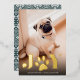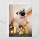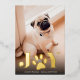 Whimsical holiday photo card features a favourite photo of your dog with "JOY" as a gold foil text overlay at the bottom. A sweet paw print illustration takes the place of the "O." Personalise with your custom greeting and names along the bottom.