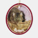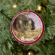 Pet photo Christmas ornament done in a round shape ceramic, with graphics of a red framed custom photo, on the front with white text. The back is done in red, blue and white with graphic text reading Merry Christmas and a custom year for you to personalise. Add you pet's picture, name and the year for a great holiday ornament to remember your pet.