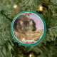 Pet photo Christmas ornament done in a round shape ceramic, with graphics of a teal framed custom photo, on the front with white text. The back is done in teal, salmon pink and white with graphic text reading Merry Christmas and a custom year for you to personalise. Add you pet's picture, name and the year for a great holiday ornament to remember your pet.