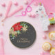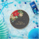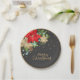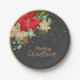 This paper plate features a Poinsettia arrangement in the upper left corner with the words "Merry Christmas in gold on a black background with a gold border.