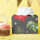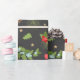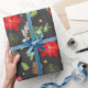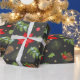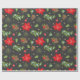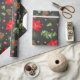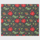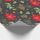 This festive wrapping paper features a poinsettia and pinecone pattern on a black background.