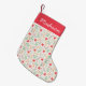 Cute and stylish Christmas stockings featuring your name at the top of the design in a white script font with a red background. The personalised Christmas stockings feature a pattern of red poinsettia flowers with green and gold foliage. The design repeats on the back.