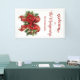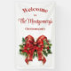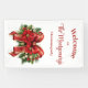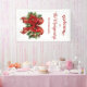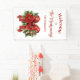 Banner with a festive Christmas bow in red and gold. Surrounded by poinsettia flowers, pine and Christmas decorations.