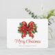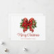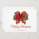 A flat holiday card with a festive Christmas bow in red and gold. Surrounded by poinsettia flowers, pine and Christmas decorations.