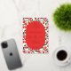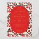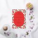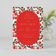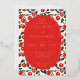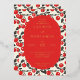 This wedding invitation features a playful yet elegant design with a central oval filled with text, surrounded by a border of bright red cherries and black leaves on a cream background. The color palette includes deep red, black, and cream, creating a festive and inviting mood. The clean lines and flat colors give it a modern graphic look, while the serif typography adds sophistication. Perfect for couples looking to celebrate their special day with a touch of whimsy and charm.