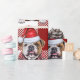 This is the perfect holiday gift wrap for the dog lover and bulldog mum, they are sure to wag with delight when you wrap their gift in this red and white plaid with an expressive bulldog who wears a winter sweater and Santa hat.