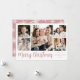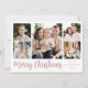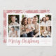 Modern holiday photo card featuring your favourite 5 photos arranged in a collage layout. Your custom greeting is featured in an elegant dusty rose script with your family name and the year displayed to the right. The card reverses to display a rose pink and white snowflake pattern.