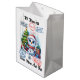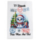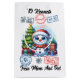 A whimsical representation of a snowy character wearing a Santa hat, surrounded by colourful presents and a beautifully decorated Christmas tree. Festive stamps embellish the background, celebrating the spirit of the holiday season with joy and cheer.