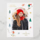 Festive foil holiday postcard featuring your arched photo surrounded by colourful skiers, gold foil stars, and pine trees. Personalise the front of the photo Christmas postcard with your custom greeting (currently shown as "Merriest Christmas"), family name, and year in gold foil lettering. The ski-themed holiday postcard reverses to display your return address and custom message.