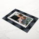 This classic and elegant custom "Happiest Holidays" Christmas holiday card features a landscape photo framed by a festive and rustic chic slate gray blue and black tartan plaid pattern with real rose gold foil accents. Personalize with your choice of holiday greeting, the modern family signature in script writing, the year, and choose to include an additional message on the back of the card. Two additional photo spaces are also included on the back.