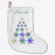 Festive Snowflake Christmas Tree Script Christmas Stocking. Beautiful colourful Christmas tree made of big and small colourful snowflakes. Personalise the stocking with name.