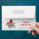This festive Christmas envelope exudes cheerful holiday spirit with its vibrant liner of diagonal red, green, and white stripes—a classic palette that instantly evokes candy canes and cozy winter scenes. The envelope features a striking red cardinal perched gracefully on a cluster of winter greenery, including eucalyptus leaves and bright berries, adding a touch of natural elegance. The greeting, “MERRY CHRISTMAS from our house to yours,” is rendered in a decorative red font that balances boldness with warmth, making the entire ensemble feel both traditional and heartfelt—perfect for spreading seasonal joy.