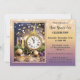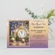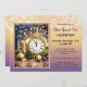 A festive New Year's Eve party invitation featuring two sparkling wine glasses with a clock surrounded by confetti and celebratory lights. The background shows a modern design in purple and gold.
