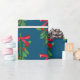 Whimsical Christmas gift wrapping paper featuring an illustration of a green and red mistletoe turned into a repeating pattern. The background is teal. Use this product to wrap your holiday gifts!