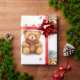 "Feel the embrace of winter with our delightful wrapping paper, featuring teddy bears in red dresses amidst a winter wonderland."