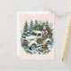 This delightful scene features a vintage green truck brimming with holiday cheer, parked in a snowy forest. The truck’s bed is packed with Christmas gifts wrapped in colourful paper, festive wreaths, a snowman wearing scarf and a small Christmas tree. Snow-covered fir trees surround the vehicle, creating a serene winter wonderland. Adding a whimsical touch, a pair of rabbits in warm winter attire playfully sit around the truck, inspecting the gifts. A bright red sled leans against the truck, completing this nostalgic holiday delivery scene.