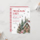 Invite guests to your Christmas party with this elegant and festive watercolor invitation, featuring a cosy winter cabin and forest scene placed in the bottom right corner. The snowy cabin, pine trees, and holly berries create a warm and inviting holiday atmosphere, complete with a wreath on the door and smoke rising from the chimney.