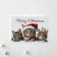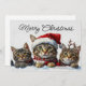 Three adorable kittens sit side by side in the snow, dressed in charming Christmas accessories. The center kitten wears a cozy Santa hat and scarf, while its companions add to the festive spirit with warm winter details. Soft snowflakes and expressive eyes create a heartwarming holiday scene filled with warmth, cuteness, and Christmas joy.