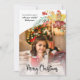Colourful and festive sprays of Autumn leaves and winter greenery & berries with custom calligraphy Merry Christmas greeting and curved photo template with editable text fields.