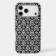Vintage inspired decorative damask surface pattern design in white detail on a black background.